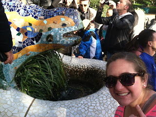 Eventually we wandered back down to the fountain, which was all about Gaudi's colored tiles. There were SO many people around but there were some great views from the top of the fountain of the Hansel and Gretl style houses at the bottom. And of course, the famous lizard that was covered in tiles.